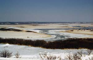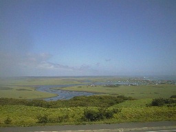 これが展望台からの景色。中央を蛇行しているのは琵琶瀬川です。右の方に小さく点々としているのは家。ずっと遠くの方に集落があるんです。 この家の大きさから、湿原がどれくらいほどか分かると思います。 |