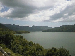| 北海道の魅力の1つに「広い景色」というのがあります。滝川からはJR根室本線沿いに南下していったのですが、都会を離れると広い川、畑地帯、平原。車も少なく、ちょっと暑い以外は快調に先に進むことができます。 | ![]() 空知川にあるダム付近の景色。(芦別) |