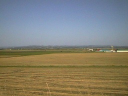 帯広は都会なのですが、ちょっと外に出ると、ごらんの広々とした景色。「十勝地方」というと畑作地帯、というイメージが私にあって、このようにどこまでも続く農場は自分のそれにぴったりとあった感じがします。 |