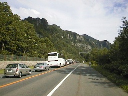 上川から層雲峡を見に国道を下っていったのですが、残り4kmというところで渋滞にあってしまいました。最初はのろのろ進んでいたもののしまいにはぴたっと止まってしまい、そのまま30分以上も動けなくなってしまったために進路変更を余儀なくされてしまったのです。右の車線に入って今来た道を返ることになったのですが、この渋滞は10km以上も続いていました。なぜこうなったのかは未だに不明です。 |