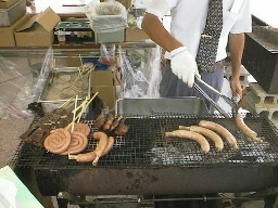 滝川市の江部乙にある「道の駅たきかわ」では、写真の骨付きソーセージや串刺しのラム肉などを焼いて売っていました。やはり滝川というと羊の肉のイメージがありますね(^^;。 |