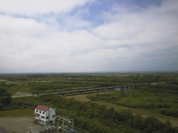 科学館には展望台もあり、ここから周辺と海の方まで見渡すことができます。こちらは陸側、川のある方なのですが、周囲に山がないので、遠くまで見渡すことができました。 |