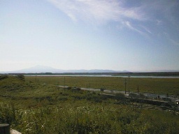 昨日と同じように、道中は左手にオホーツク海、右手には小清水原生花園の景色を通ります。道路は直線で、窓を開けて走ると非常に気持ちがいい。途中止まるならJR原生花園近くの駐車場がいいでしょうか。 左の写真はその近くで撮影したもの。遠くに見える山は斜里岳です。 |