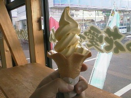 これが「菜の花ソフト」。やや黄色っぽい色をしており油っぽいイメージがあるのですが、実際はややコクがあるものの油っぽさはなく、程良い甘さのおいしいソフトクリームでした。