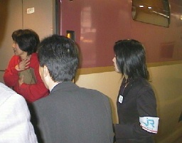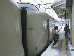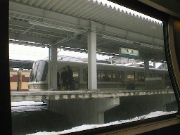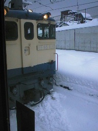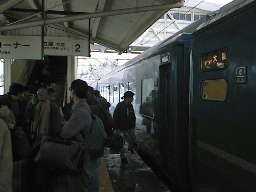 |   「サンライズ」は14両で、前半分が四国へ、後ろ半分は出雲市へ行くのですが、ホームに雪が積もっている関係で通常のドアから降りることができず、前半分に乗っていた乗客は列車の真ん中まで来て、乗務員室の扉から降りるはめに。 |   隣のホームで普通列車を待つことになったのですが、急行「銀河」の乗客も混じってしまったためにホームは大混乱。普通列車は1本出てしまったあとだったので、40分くらいも来ないのでその間待っていることに? |
