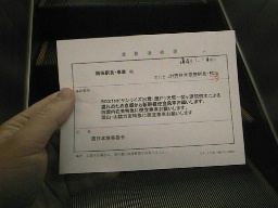 |   京都駅では係員の方が待ちかまえており、ここで降りてくる乗客に連絡書を渡してくれます。「サンライズ」はここで運転打ち切りとなるわけではないので、特に時間を気にしない人は乗り続けることもできるのですが、この辺りがみなさんよく分かっていなかったようですね。 |   これがその「業務連絡書」。「サンライズ」が遅れたために、乗客が新幹線、四国内の特急、山陰方面への特急列車に乗車できるように書かれてあるものです。列車は東海、西日本、四国といくつものJRがまたがるためにこのようなものが必要になるのでしょうか。ちなみに指示もとはJR西日本でした。 |