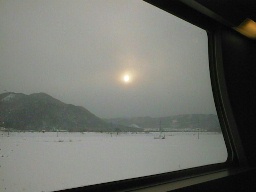 ほんとなら金比羅参りにでも行ける時間なのに・・・・と思いつつ、ここから新幹線に。もちろん朝食など取っていない(7時半には高松に着く予定だったので、買い込みもしていない)ので、ここで駅弁を買って、遅い朝食。 新幹線も5〜10分くらい遅れていたらしく、雪のなくなったこの辺りから遅れを取り戻すために一生懸命走っていました(^^;。