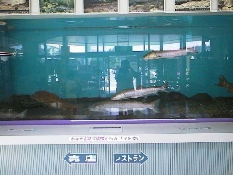 場所はカヌーで有名なかなやま湖近くにあり、建物はカヌーの軸先をイメージしたもの。入り口を入ると正面には左写真の”幻の魚”といわれるイトウが泳いでいます。建物内部は物産品の販売コーナーとレストラン、2階には「木の町南富良野と郷土史」と題した展示コーナーがあります。