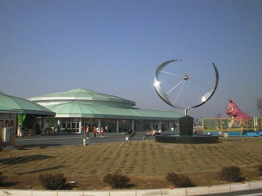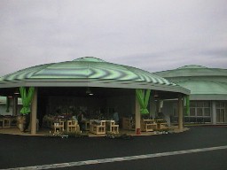 | 田沼町の中の、南のはずれにあるのに「どまんなか」と言っているのは、このあたりに日本列島の中心地点があるため(宗谷岬と佐多岬から同じ距離の所にあるらしい)。 建物は平たく丸いのが特徴で、農産物直売所(写真左)は別棟。本館の方には情報コーナーの他に地元の野菜を使った中華レストランやジェラートの販売店もあります。 |