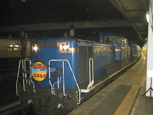 札幌−青森間の夜行客車列車。「北斗星」用のDD51が1両で牽引しています。寝台車、座席車の他にカーペット車もあります。