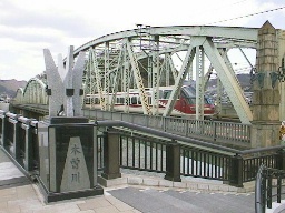 併用橋だった頃は、自動車は列車が来ると端の方によけなければなりませんが、自動車専用の橋がとなり(左側)にできたことで、危険な通行をせずに済むようになりました。 写真は犬山遊園側から。