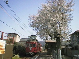 沿線にはすでに多くの鉄道ファンがこの車両と桜のマッチしたところを撮ろうとあちこちで待ちかまえていたのですが、この駅ではそれほど多くもなく谷汲や北野畑駅の方に流れていたようです。 この桜も花は散り始めていたのですが、なかなか車両に似合いだと思いませんか? |