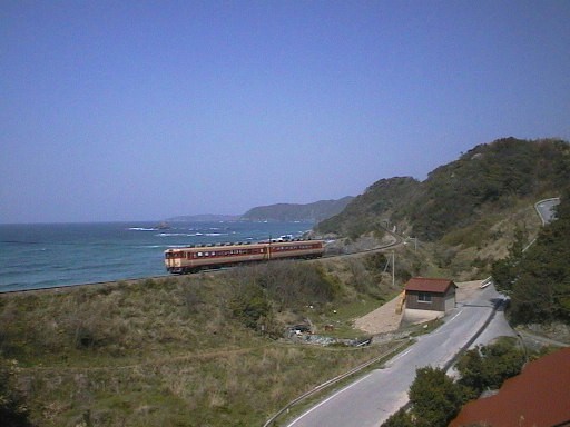 海岸近くの撮影ポイントがある道の駅から、ちょっと移動したところにある山に登って撮ったもの。さんざん苦労して登ったのはいいのですが、メンバーはみな望遠レンズでトンネルあたりを狙っていました。当然だわな・・・(--;