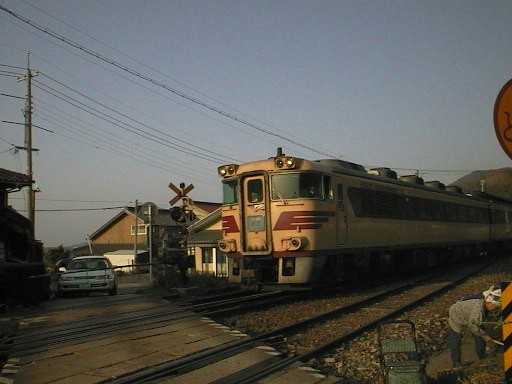 特急がこっちに走ってくるのを見つけて、慌ててカメラを構えて撮ったもの。 右端にいるおばあちゃん、列車来ているのに平然と草刈りをしていました。踏切鳴ってるのに・・・
