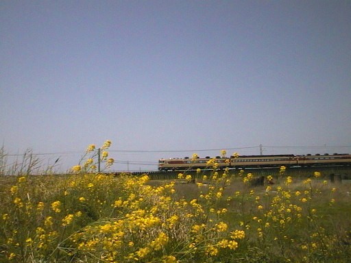 出雲市の川沿いで撮った写真の、キハ181バージョン。線路が微妙に斜めになっています(--;。 この時は強風で、低い姿勢で構えていたために位置が固まらなかったというのがいいわけ。菜の花も風に吹かれて倒れかけているでしょう?