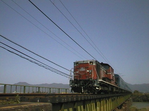 先ほどの川沿いから、鉄橋近くまで近づいて撮った「出雲」の回送時のもの。低いところだと近すぎると機関車しか見えなくなってしまうし、、もうちょっと上に上がれたかも知れませんが、レールに近づいて撮るのはマナー違反になるでしょうか。