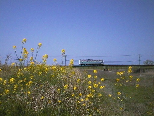 「桜が終わったら、つぎは菜の花かツツジだよねぇ・・・・・」 メンバーの人たちは鉄道だけでなく、花暦のチェックも欠かせていません。 こちらはキハ120バージョン。1両ではちょっとさびしいですね。