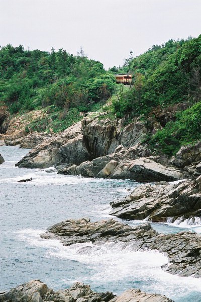 山陰の荒々しい海岸、というより崖っぷちのような所を走るキハ58。日本海の西部はこのような大きな岩場や小さな島の点在する他では見られない景色のところが多いです。