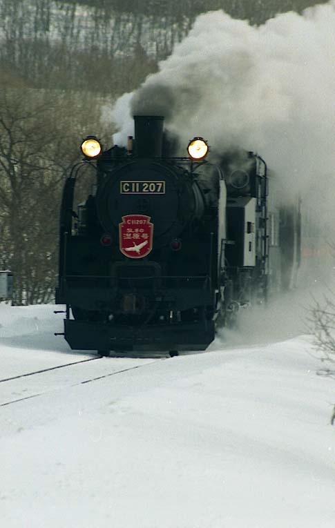 このC11型207号機機関車は、北海道用に雪の中でも視野を確保するため、2個のヘッドランプを付けています。 ヘッドマークはこの付近の大空を舞うツルの姿。運が良ければ、駅のすぐ近くで見ることもできます。