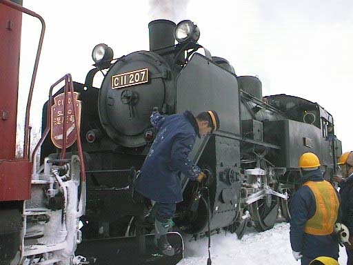 機関車の折り返し駅での風景。機関車の位置を付け替えることを「機まわし」と言います。写真はその作業が終わった直後のもの。 この路線では機関車の向きを変える設備がないため、釧路行きの折り返し列車は後ろ向きの機関車が先頭になります。