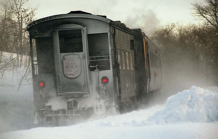 釧路行き列車の一番後ろはこんな感じ。 最後部は空気の渦ができやすく、粉雪を巻き込むために正面よりも多く雪が着きます。 こちらにもヘッドマークがあるのですが、雪が付着して真っ白になっていますね。