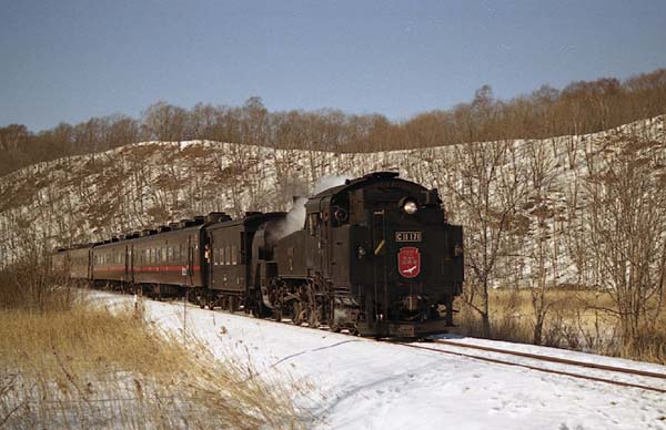 使用されている客車は14系3両と旧型客車1両。その両端に車掌車が付きます。車内にはだるまストーブもあります。 3日目に撮影したときには機関車は1両。気温が高かったせいか、煙が少なめでした。