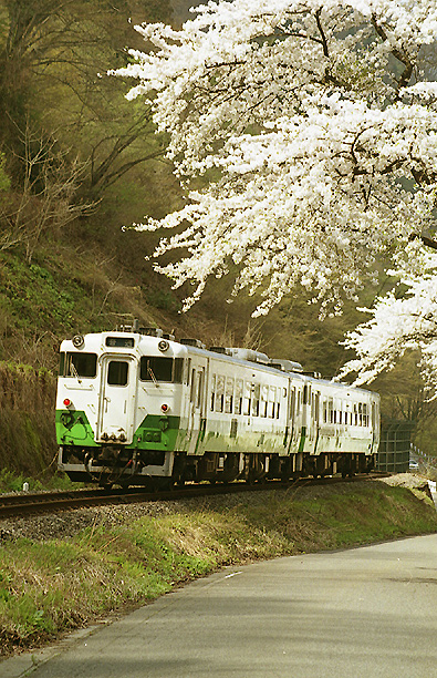 こちらは前ページの、桜の木のすぐ近くで撮影したもの。道路が気と線路の真ん中にあったので撮影には苦労しました。 レールの間には柵などないのですね(^^)。ちなみにこの道路は、先の方が通行止めになっていました(落石のため?)。
