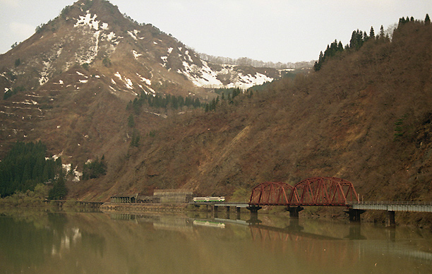 ここも只見線の中では有名な撮影ポイント。只見川の水は決してきれいとは言えないのですが、まだ雪の残る山やつぎはぎのような鉄橋、 その間を走る小さな列車もすべて映し出しています。 桜を追いかけて来たのに、このあたりはまだ雪が残り、桜もつぼみのまま。