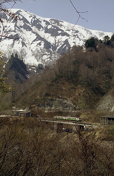 この地点も、もうすっかり高いところに来ています。遠くに見えるのは浅草岳。ここから左方向は「六十里越」といわれる険しい道路と長いトンネルが続きます。 沿線を通っていくうちに、春先から冬へと逆戻りしたよう。この写真もスノーシェッド越しに撮ったものです。