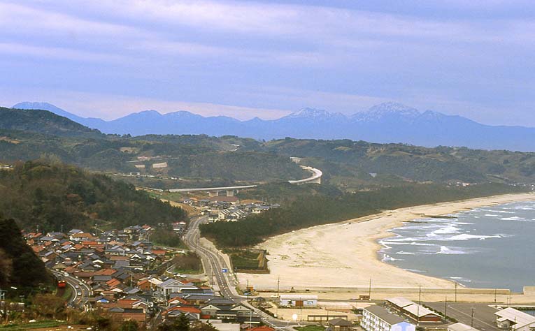 こちらは泊駅近くにある高台の公園から撮影。山陰に多く見られる白い砂浜、建設中の高速道路、遙かかなたには大山も見えます。鳥取県では本当に海沿い近くを走るところは少なく、海と組み合わせるためにはこれくらいのスケールじゃないと・・・・