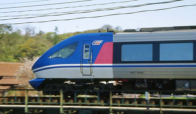 青谷駅にあるもう1つの桜のスポットから。きれいな桜並木があるもののどうしても車両と合わせることができず、思い切って車両をアップにして流し撮りにしたもの。「CKK」は智頭急行のマーク。とがった先頭の形がなんともスピード感があるでしょう?