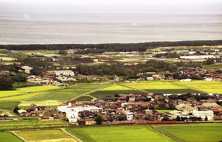 この辺りにある低い山の、頂上にある展望台から撮影。広い平野の中をぽつんと走る列車は、山陰の他の地域では見られない雄大さがあらわれています。田んぼの色も変わり、そろそろ収穫の季節でしょうか。 (写真はノイズ修正の箇所があります)