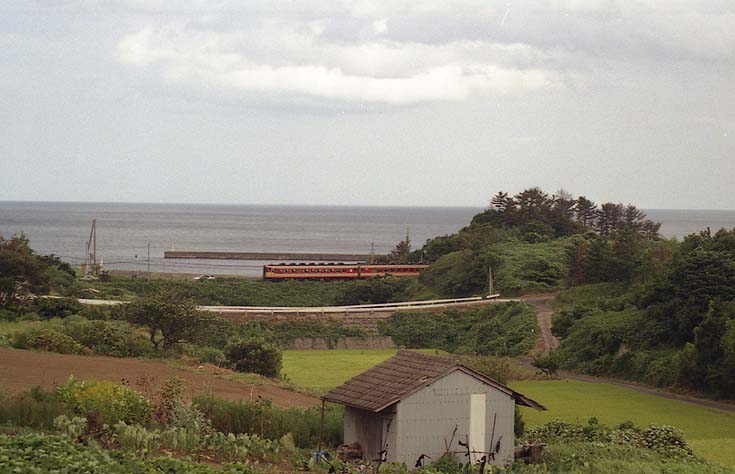 港からの写真と同じところを、線路の反対側から撮影。天気が良ければ、南国ムードさえ漂うところだったかも。 ちなみにこの辺りは、谷の方は田んぼだったのですが丘の上は一面のナシ畑。これが入れば鳥取らしかったのですが、木々の向こうではうまく行かないか。