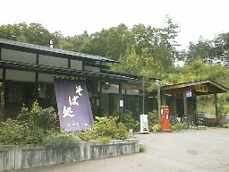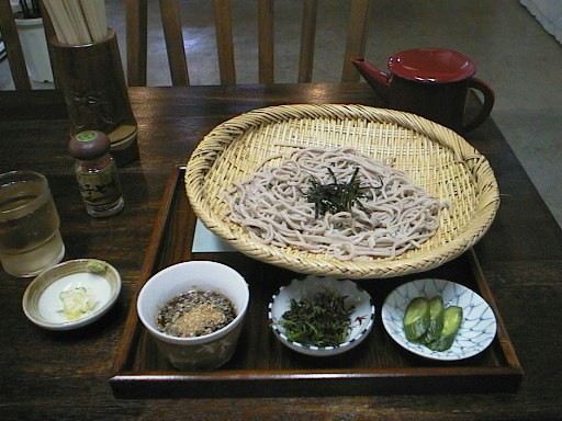 この近くにあったそば屋と、そこで食べた「ごましそざる」そば。 |