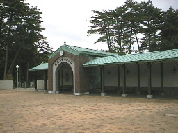 | (童話村入り口) 記念館のあるところから坂道をおり、入り口付近に戻ってから道路と反対側に行くと(宮沢賢治童話村)があります。 この入り口も「銀河鉄道の夜」にちなんだ駅舎の形をしています。 |