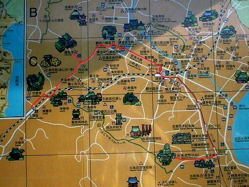 鎌倉周辺の地図です。私が歩いたのは赤い線の所。ただし鎌倉−長谷間は江ノ電に乗り、大仏を見たあとはバスで鎌倉駅まで帰ってきました。 写真のあるところは、クリックするとその部分に行きます。
