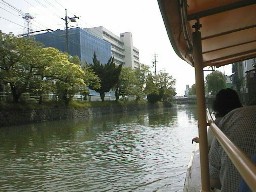 | (船の出発直後の様子) 船着き場はいくつかあるのですが、いちばん南側にあるのはカラコロ広場と言われる、みやげ屋やカフェテラスなどのあるところ。ここから外堀、内堀を1周します。 左に見えるのは日赤病院、遠くに見えるのは栄橋です。 |