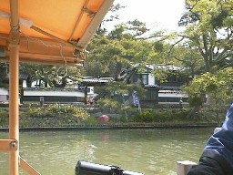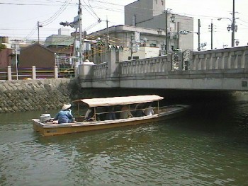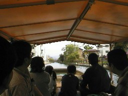 (船の中) 船は和風のもので、10〜12人程度でござの上に座りながらあちこちを見ていきます。 低い橋をくぐるときは屋根が下がる構造になっており、乗客も頭を低くしなければなりません。 遠くに見えるのは米子橋です。 | |