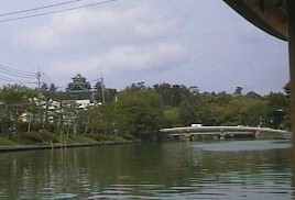 | (松江城と宇賀橋) 左の遠くに見えるのが松江城。周囲は緑に覆われており、城壁がそれほど高くないことが特徴。これはかつてこの辺りが湿地帯で外敵の侵入の恐れが少なかったことによります。 |