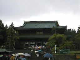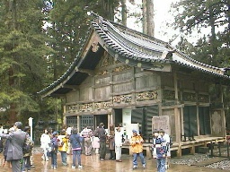 | (輪王寺三仏堂) 参道の一番手前右にあり、最大の伽藍です。766年に開かれたという古いお寺で、後に徳川家康が東照宮にまつられてから皇族が住職として入る寺院となって栄えました。 道内には3つの座像(各8.5mの金色木彫)があり、名前はここから由来しています。 |  | |