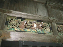 |  | (神厩舎) 神馬のいる馬小屋で、「見ざる、言わざる、聞かざる」の三猿で有名。 猿は馬を守る動物と言うことで彫られたもので、他にも合計で8面16匹の猿がいます。 |  |