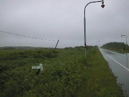 | (オホーツク沿岸付近の道) 浜頓別はバスターミナルになっていて、中に少しだけ天北線の 展示コーナーがありました。 その先は国道ではなくて、それより内陸側にある道道沿いを 走っていました。 この道道は天北線廃止後にできたらしいのですが、写真の ような勾配標が残っていることでむかし路線があったのだな と言うのが分かります。 |