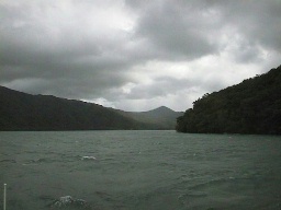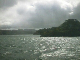 中湖に入ってからは、写真の御倉半島に近づいてから、湾の中を一周します。東側にあるこの半島は正面に断崖絶壁があり、中山半島とは対照的。 |