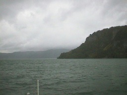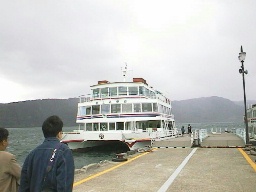 (湖を渡る遊覧船) 南西部の休屋(やすみや)というところから、左の船に乗っていきます。 | |